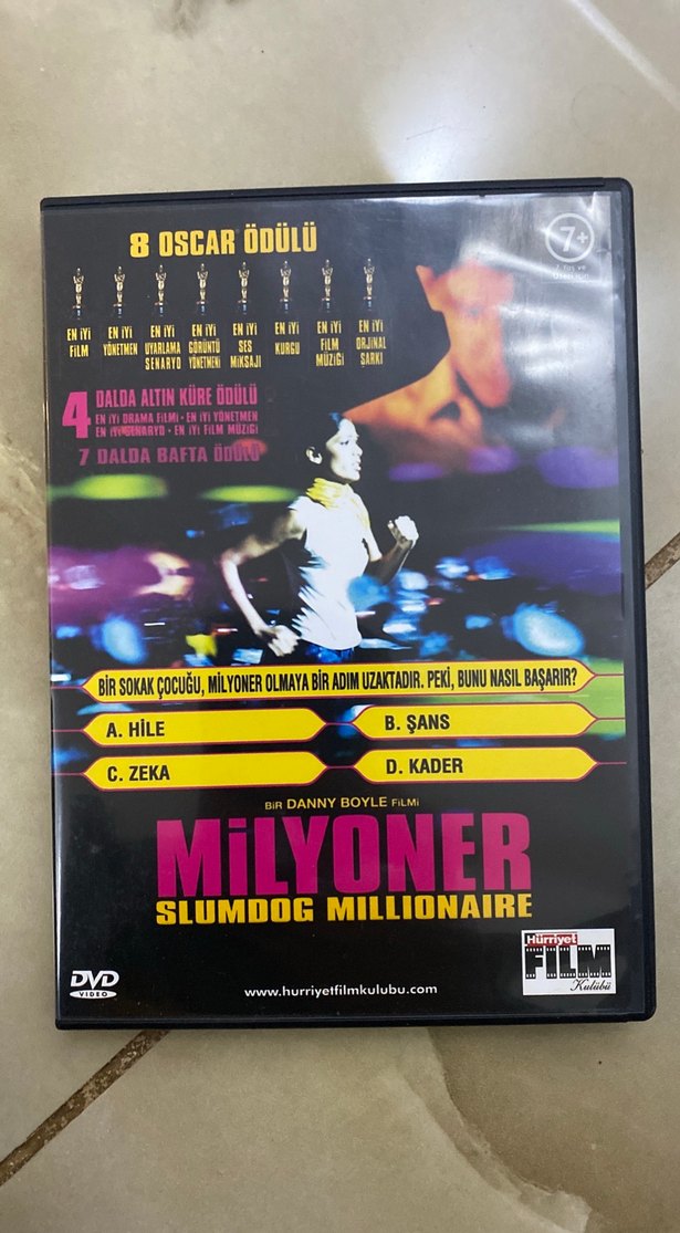 8 Oscar ödüllü Slumdog Millionaire DVD'si. Bir sokak çocuğunun milyoner olma hikayesi anlatılıyor.