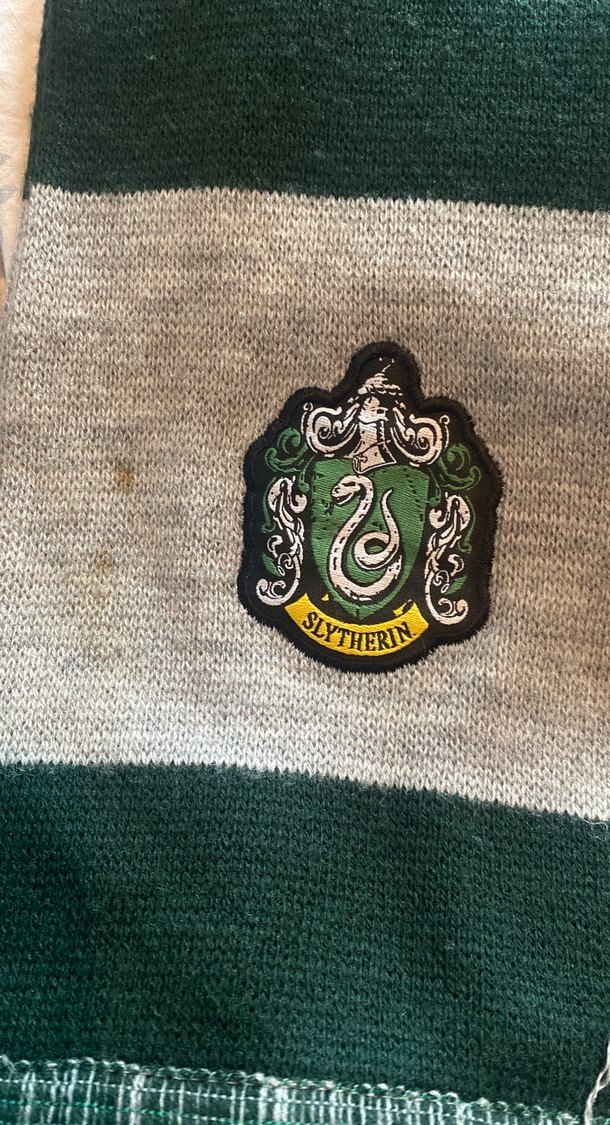 Harry Potter Slytherin armalı atkı, ilk fotoğraftaki kısımda göründüğü gibi küçük bi lekesi var ama onun dışında hiçbir defosu yok
