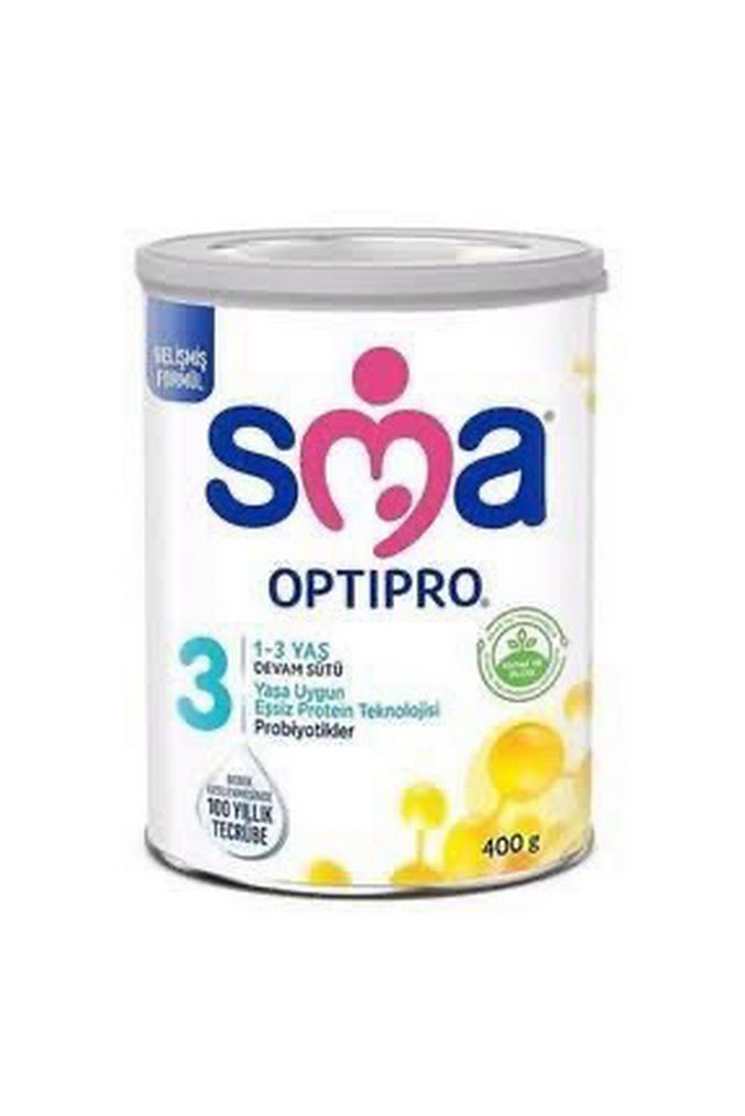 1-3 yaş çocuklar için SMA Optipro 3 devam sütü, eşsiz protein teknolojisi ve probiyotikler içerir. 400g kutuda, pastel beyaz tasarımda.