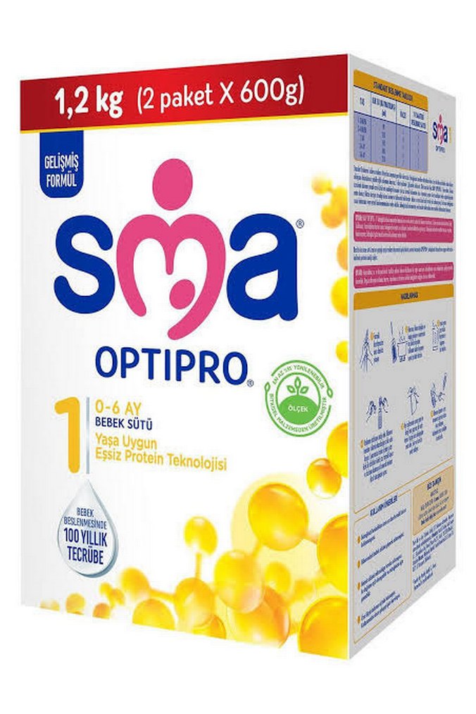 0-6 ay bebekler için SMA Optipro gelişmiş protein teknolojili bebek sütü. 1,2 kg (2 paket x 600g), pastel sarı renklidir.