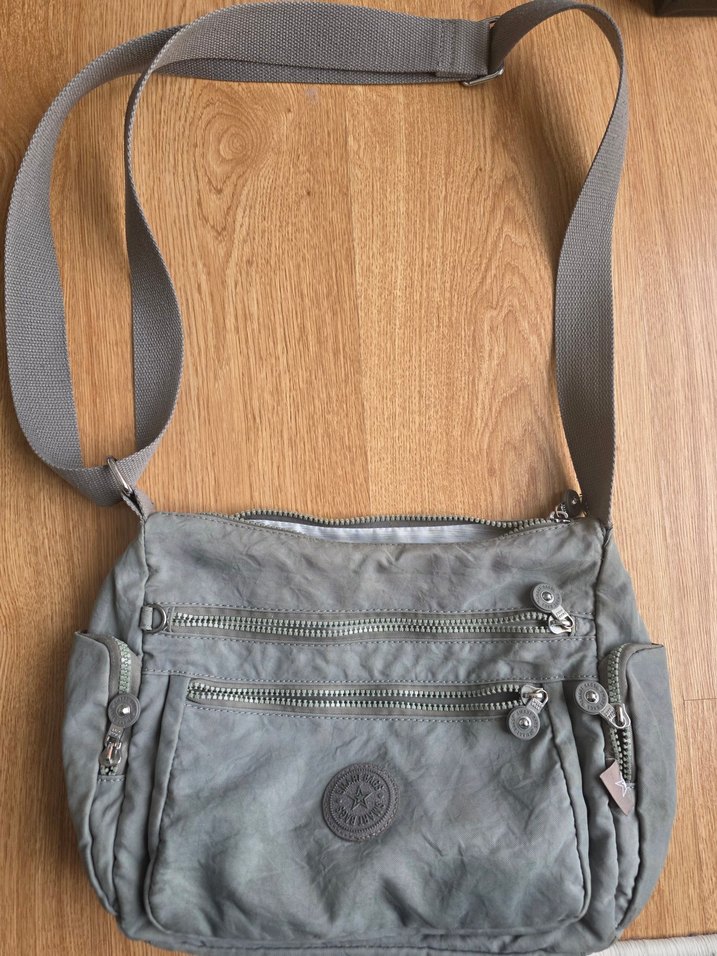 Gri renkli kadın çapraz çanta, ayarlanabilir askı ve çoklu fermuarlı ceplere sahiptir. Dayanıklı sentetik kumaştan yapılmıştır, günlük kullanım için uygundur.