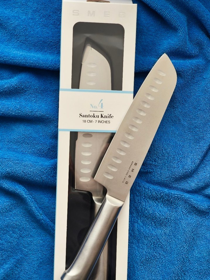 SMEG santoku bıçağı, ağız uzunluğu 18cm , Alman çeliği, Smeg şef bıçak şerisinin bir parçasıdır. tek olarak verilmektedir. NOT: adetli olduğundan, satın almadan önce lütfen yazınız. kutusu ile verilecektir.