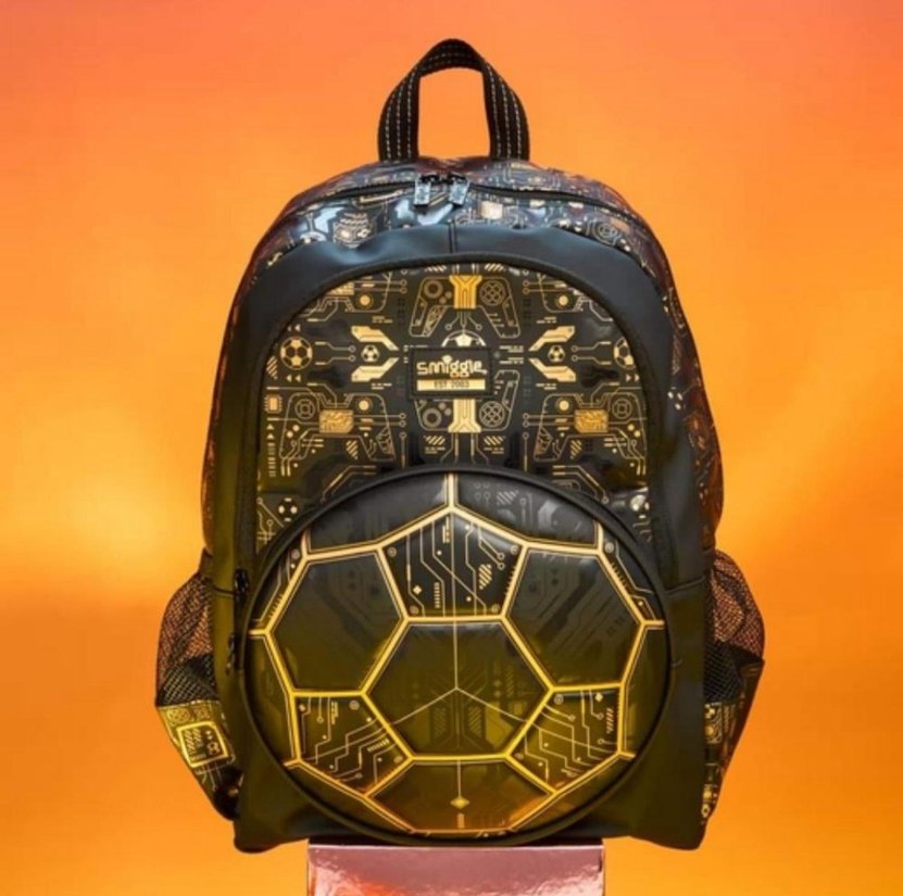 Futbol temalı ön cebi ve yan file bölmeleri olan siyah çocuk okul çantası. Dayanıklı üst sap ve dolgulu askılar içerir. ⚽