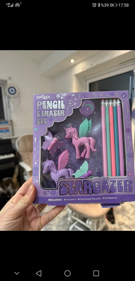 Bu mor pastel Smiggle seti, beş kalem, dört unicorn şeklinde silgi ve bir kalemtıraş içerir. Setin teması unicorn figürleridir.