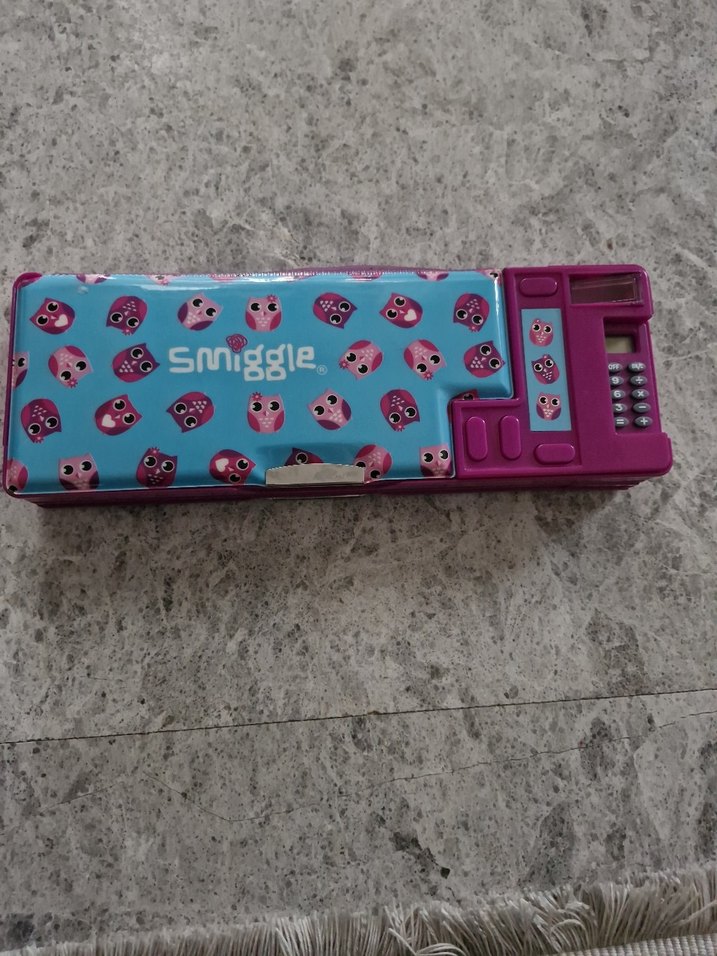 Mor renkte, baykuş desenli ve hesap makinesi özellikli çocuk kalem kutusu. Arka kismindaki etiketi sokemedim uzerine yeni etiket yapistirabilir kalemtras kisminda kalemtras yoktur tuslari sorunsuz calisiyor.Resimde gozuken yerindede yirtilma vardir ama ic kapaktadir. Manyetik kapakli iki ana bölme Açilir hesap makinesi Minik silgi cekmecesi mevcuttur.