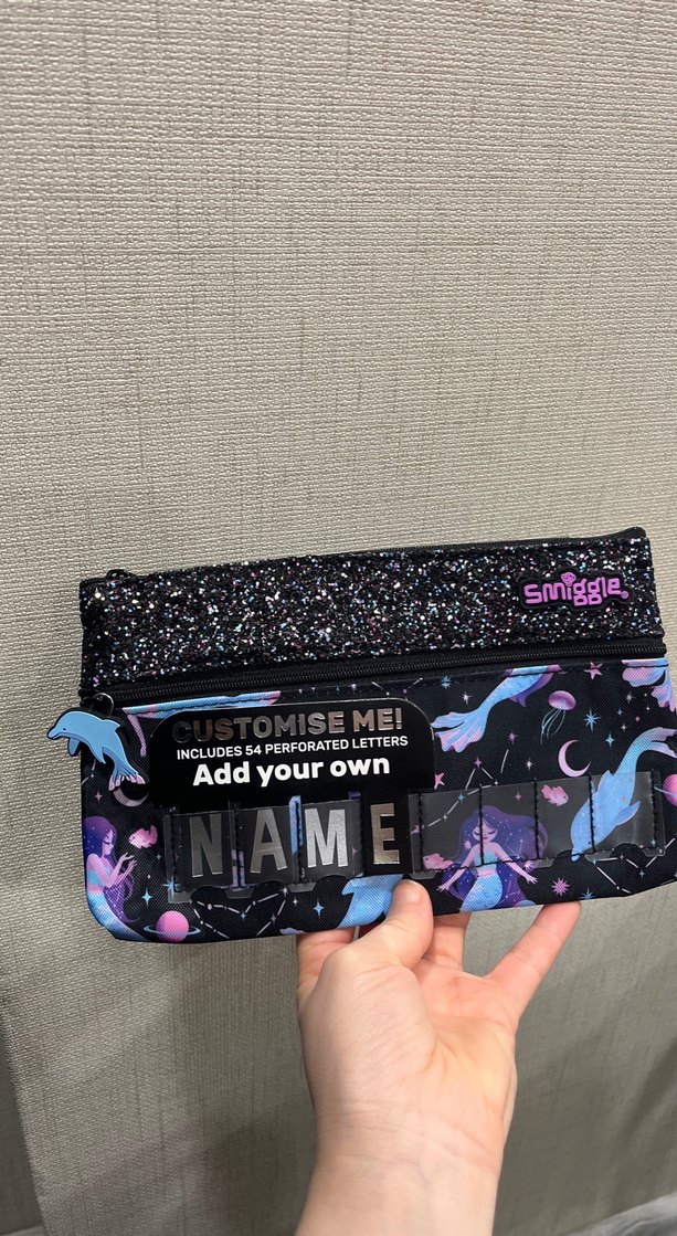 Smiggle marka siyah çocuk kalemliği, parlak üst kısmı ve 54 delikli harf ile kişiselleştirilebilir isim etiketi içerir. Yunus ve yıldız desenlidir. ✏️
