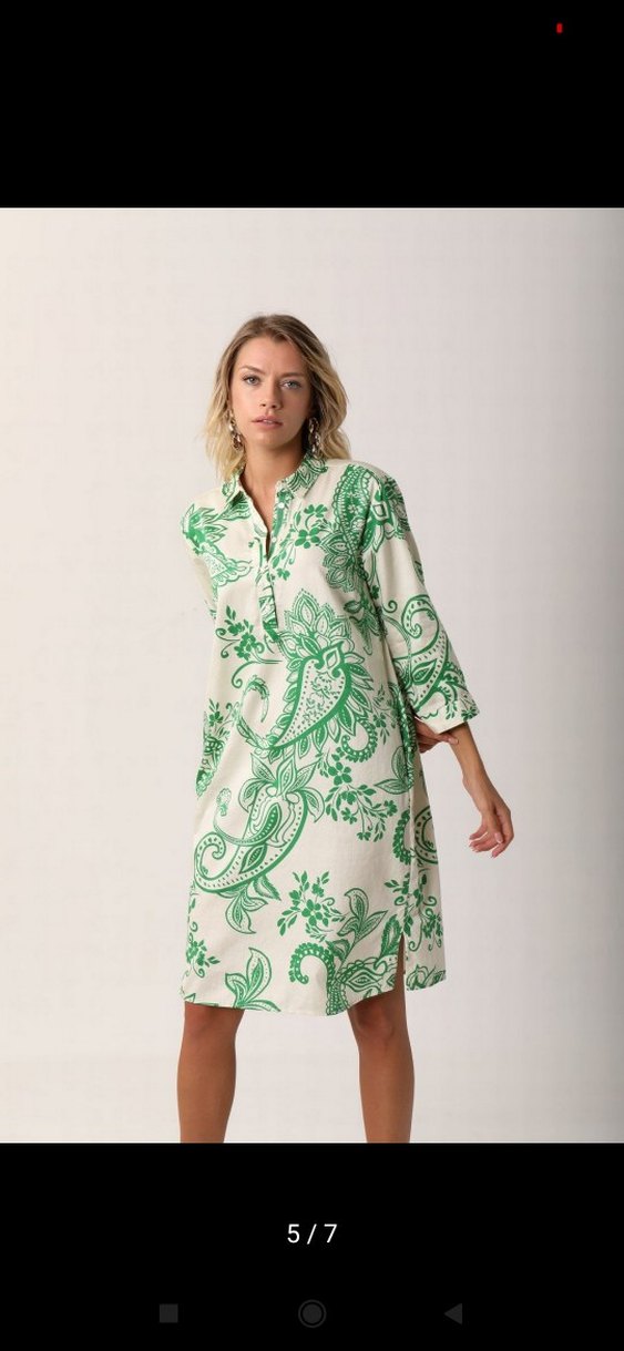 Yeşil desenli, V yakalı ve düğmeli önü olan bol kesim, hafif keten kumaştan günlük kullanıma uygun elbise. Ölçüleri Boy:94 Göğüs:49 Basen:54 Kol uzunluğu:42.5