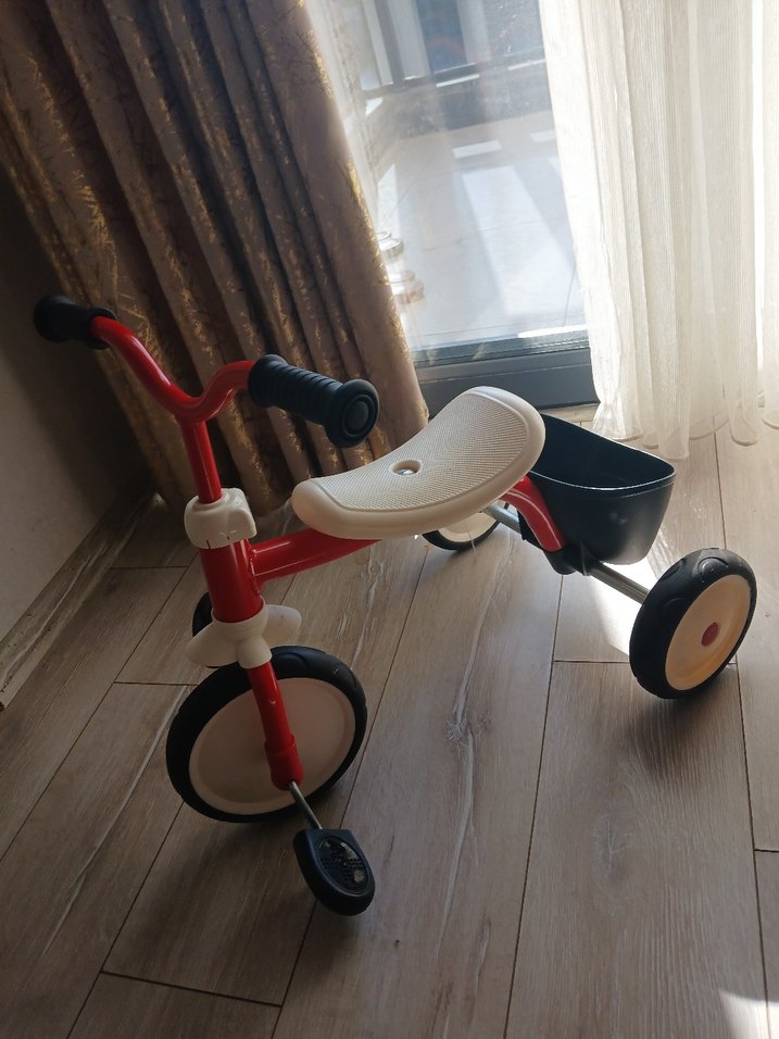 Kırmızı üç tekerlekli bisiklet, beyaz oturağı ve arka taşıma sepeti ile çocuklar için uygundur. Siyah pedalları ve tutma kolları bulunur.