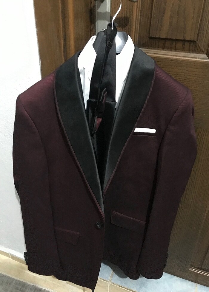 Düğünde bikaç saatliğine giyildi. Bordo renk. Gömlek yelek kuşak papyon ceket #takımelbise #smokin #damatlık. Marka temsili