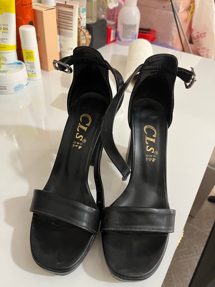 Parlak siyah yılan desenli topuklu sandalet, tokalı kayışlarla cesur gotik ve minimalist tarzı bir araya getiriyor. Günlük kullanım için uygundur.
