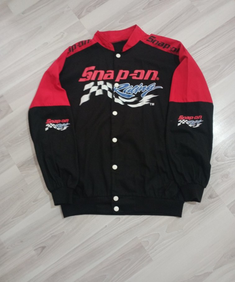 Düğmeli, bisiklet yakalı, sentetik kumaştan yapılmış, siyah ve kırmızı renklerde Snap-on baskılı, bol kesim mevsimlik mont