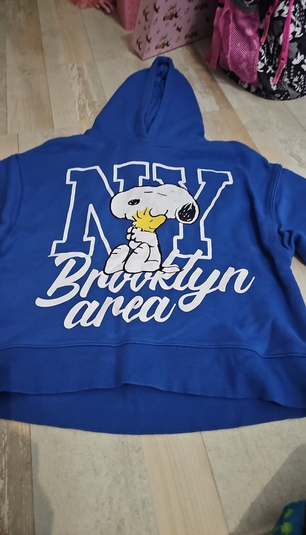 Mavi, bol kesim, parlak yüzeyli sweatshirt. Snoopy ve Brooklyn baskılı, bisiklet yaka, uzun kollu,