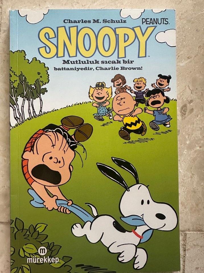 Charles M. Schulz imzalı Peanuts karakterleri Snoopy ve Charlie Brown'un yer aldığı, 'Mutluluk sıcak bir battaniyedir' temalı mizah kitabı.