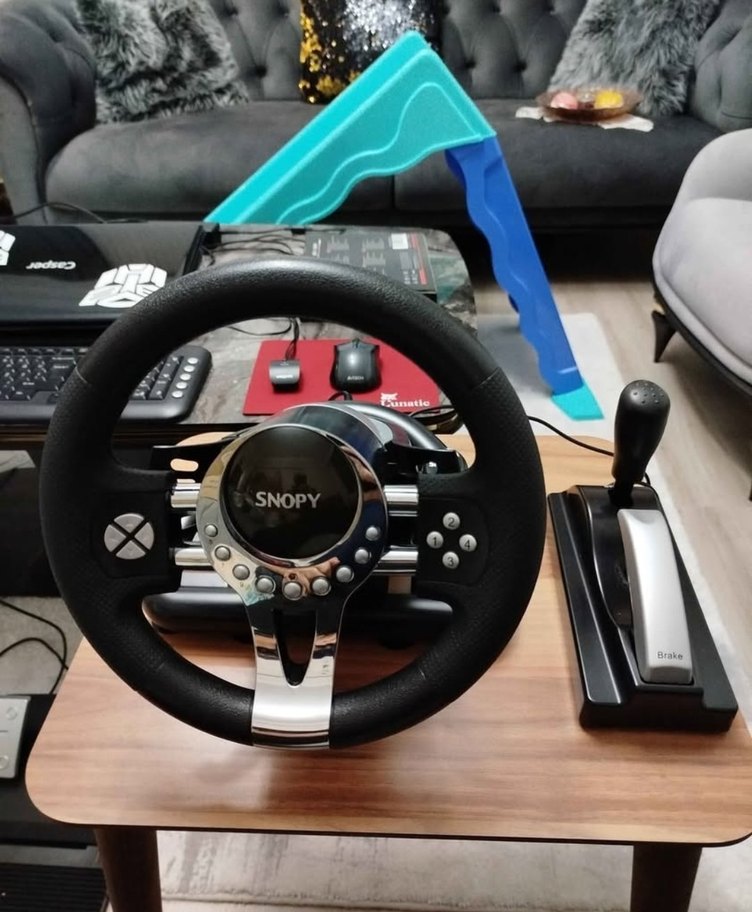 Snopy marka siyah oyun direksiyon seti, çoklu kontrol düğmeleri ve vites koluyla gerçekçi sürüş deneyimi sunar.