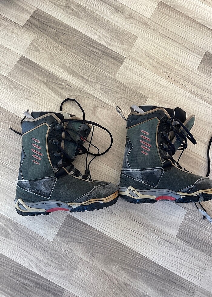 Orta sertlikte, başlangıç için ideal, taş gibi, iç kısmı sorunsuz, dışında soyulmalar var ama kullanıma engel değil, 40-41 giyenler için uygun. Asla su geçirmez ve sıcacık tutar. Elan marka. #erkek #kadın #snowboard #bot #kayak #quicksilver
