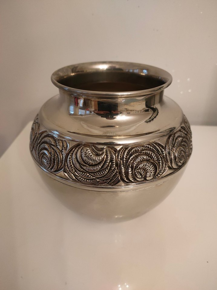 Gümüş renkte, ortasında kabartmalı çiçek desenleri bulunan dekoratif vazo.Ürün az kullanıldı dolapta durmaktan hafif kararmalar var tabi gümüşlerin kararması normaldir