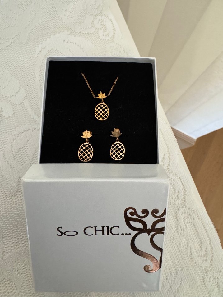 So chic Çelik kolye küpe takımı. 2 sene önce aldım 1 defa taktım fazlalık olduğu için satıyorum. Herhangi bir kusuru yoktur. Rose renktir.