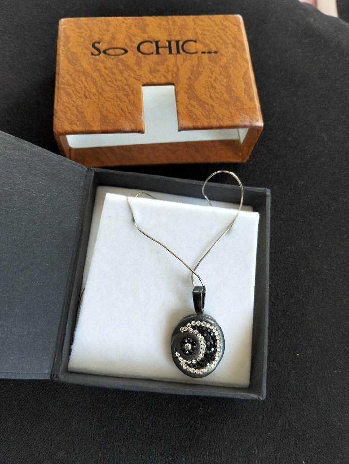 Kısa boy, zincir detaylı siyah kolye, vintage tarzda baskılı ve gotik dokunuşlu. Mini kolye ucu küçük kristallerle süslenmiş, klasik zarafet sunar. Marka: SOCHIC. orjinal ürün çok şık çok güzel ışıl ışıl hediyelik olarak da düşünülebilir şahane bir parça hem zincir hem ucu damgalı gümüş ağır bir parça