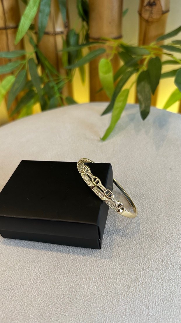 Kadın bileklik, parlak altın renkte kemerli detay ve yılan deseniyle modern klasik Paris tarzını yansıtıyor.
