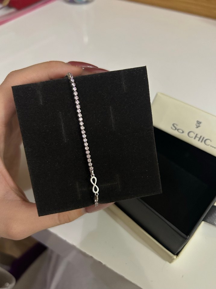 Parlak gümüş renkli, taşları pembe, zincir detaylı bileklik. Sonsuzluk sembollü, minimalist ve çağdaş tasarım. So CHIC markası. hiçbir sorunu yok kutusuyla vesaire yollayacağım