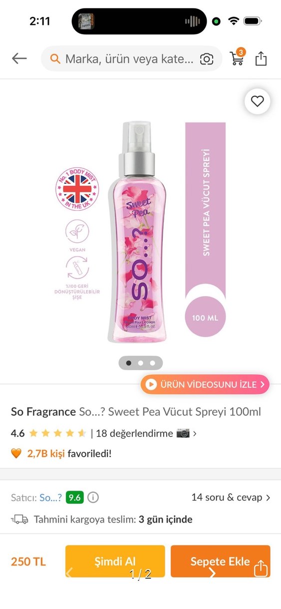 So Fragrance Sweet Pea vücut spreyi, 100 ml şişede tatlı çiçeksi koku sunar. Vegan formüle sahip, %100 geri dönüştürülebilir şişede. çok az kullanıldı