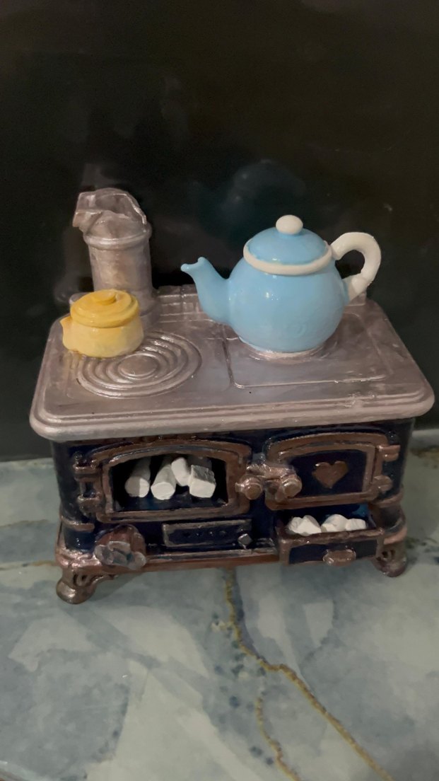 Üzerinde beyaz kulplu açık mavi seramik çaydanlık bulunan koyu mavi vintage tarzı ocak. Yanında küçük sarı kap var.