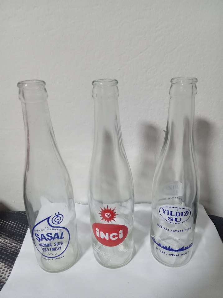 Şaşal ,İnci ve Yıldız su memba şişeleri koleksiyonluk renkli yazılı cam şişeler,..şeffaf görünümlü. İçecekler için de uygundur. 3 ü birden 500 tl.