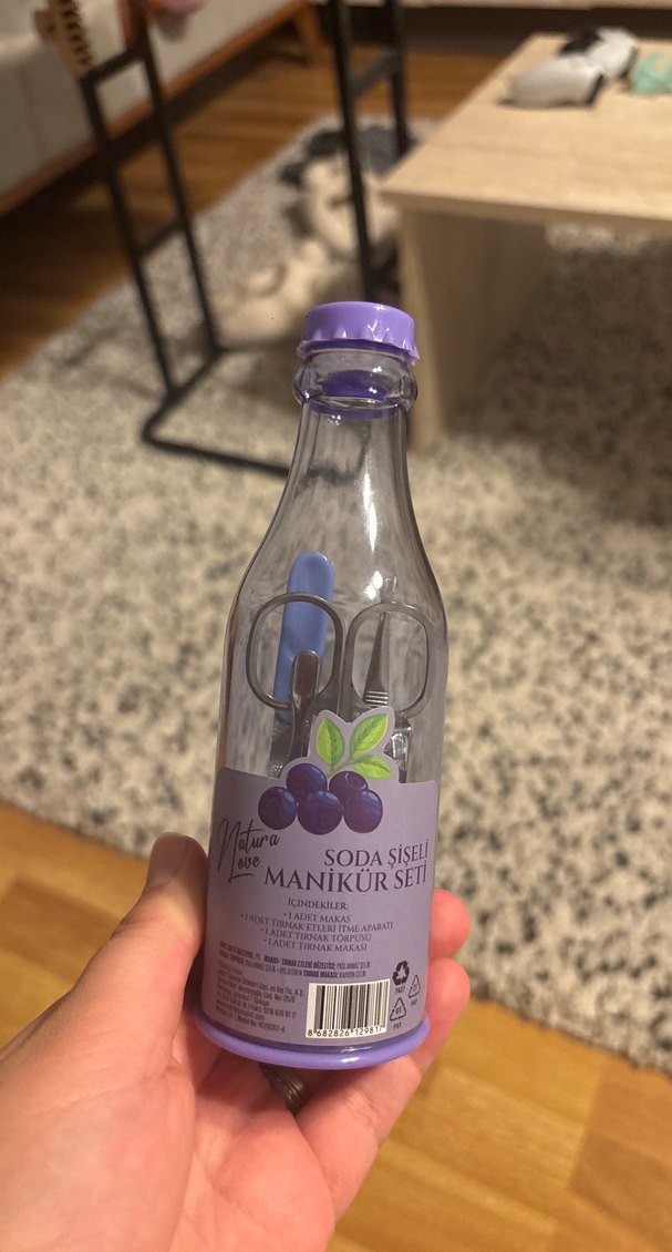 Cam soda şişesi şeklinde manikür seti. Mor kapak ve üzüm figürlü etikete sahip, temel tırnak bakım araçları içerir.
