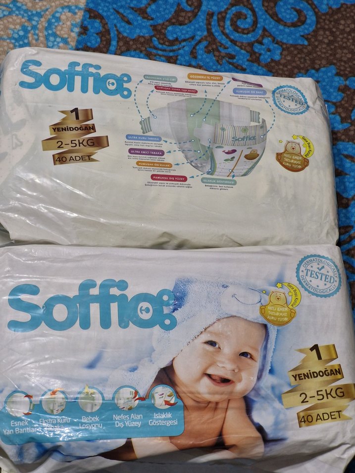 Soffio yenidoğan bebek bezi, 2-5 kg arası bebekler için 40 adet. Nefes alan kumaş, esnek bel ve ıslaklık göstergesi içerir. 2 paket olarak satıştadır.