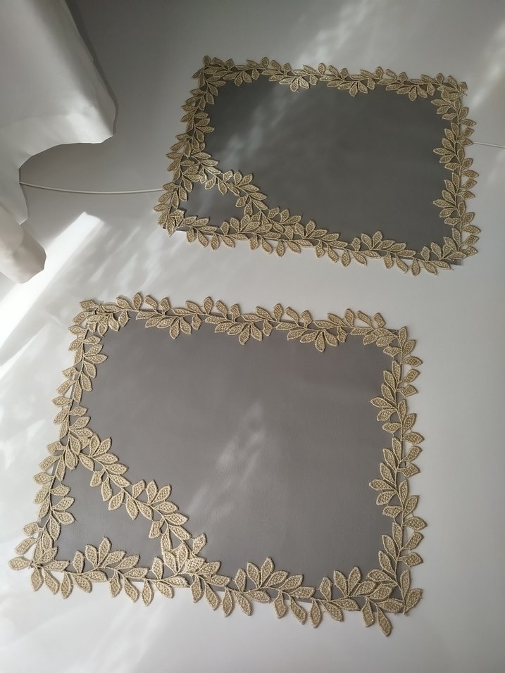 Gri suni deri üzerine yaprak detaylı gold renkli güpür amerikan servis Ölçüleri 33×43 cm'dir