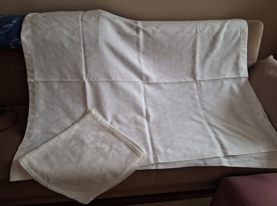 TÜM DETAYLAR EN SON RESİMDEDİR. Dikdörtgen Masa Örtüsü + 12 adet peçete. İpek Ketendir. Hiç kullanilmadi. Hiç ütülenmedi.