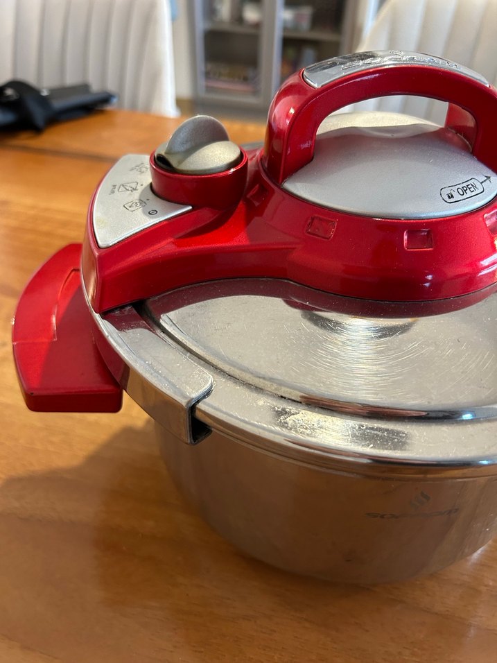 Sofram marka. 4 yada 4,5 litre düdüklü tencere. Çelik tencere kısmında hiç bir sorun yok. Kapakda lastikten dolayı bollaşma var ama kilitlenebiliyor. Bazen su akıtıyor. Kulpların altında eskimeler var. Fotoğrafta belirttim. Yenisi hediye geldiği için satıyorum. Hediye gelmeseydi kullanmaya devam ederdim.