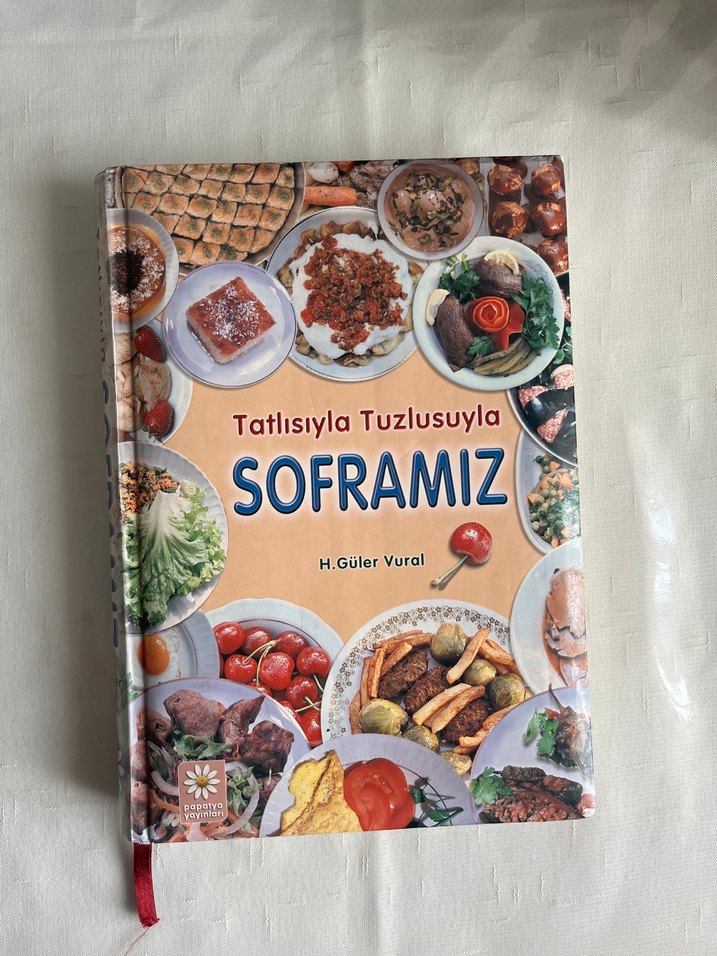 H. Güler Vural'ın 'Soframız Tatlısıyla Tuzlusuyla' adlı yemek kitabı, tatlı ve tuzlu tarifler içerir. Geleneksel yemeklerin detaylı anlatımı yer alır. Bazı sayfaları yıpranmış. Parlak kağıda renkli baskı. Toplam 471 sayfa.