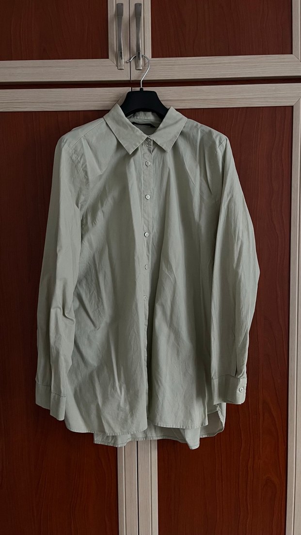 Soft yeşil keten gömlek, yakalı ve düğmeli ön tasarıma sahiptir. Uzun kollu ve normal kesimdir, günlük kullanıma uygundur. Minimalist, normcore tarzında midi uzunluktadır.