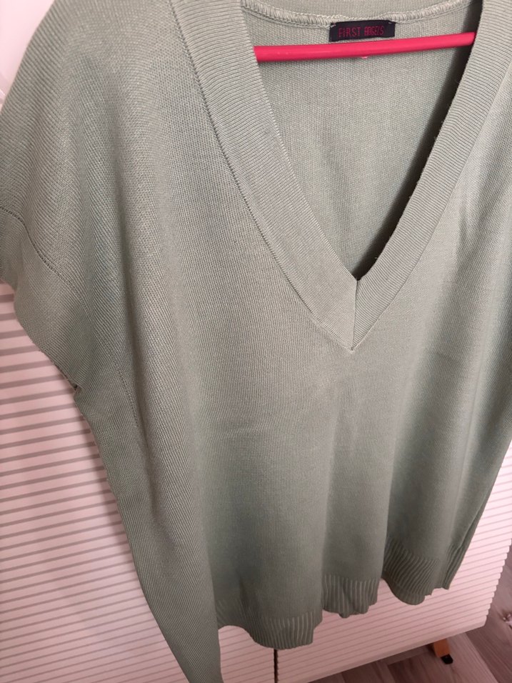 Yeşil renkli, V yakalı ve örgü desenli kadın kazak. Sentetik kumaştan, bol kesim ve normal uzunlukta uzun kolludur. Rahat ve gündelik stil için uygundur.