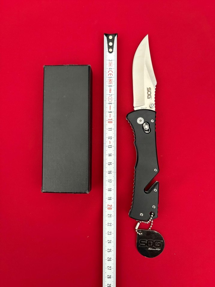 SOG katlanır bıçak siyah saplı, keskin bıçağa sahiptir. Anahtarlık etiketi ve siyah kutu ile birlikte gelir. CE5 işaretlidir.