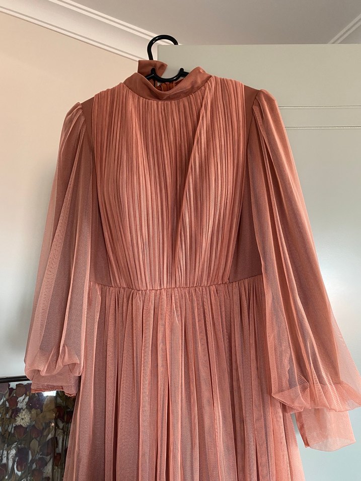 Soğan kabuğu rengi , uzun ve pilili bu elbise yüksek yakalı, uzun kollu ve vücuda oturan kesime sahiptir. İpeksi kumaştan, parlak görünümlü ve düğünler için uygundur.