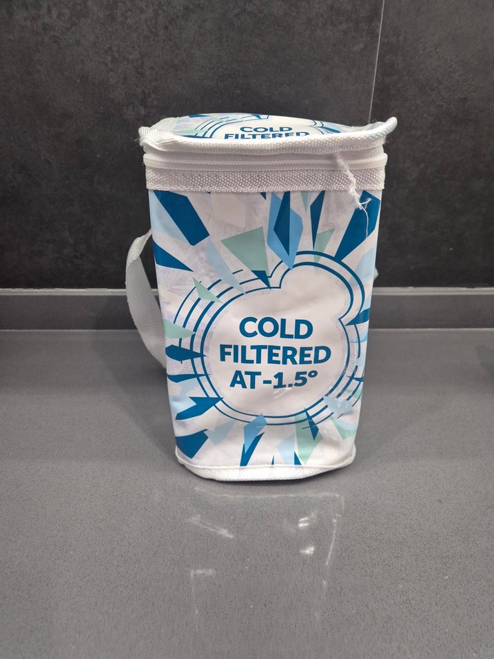 Renkli süt saklama çantası, -1.5°C'de soğuk tutma özelliğine sahiptir. Fermuarlı ve taşıma saplıdır. Üzerinde 'COLD FILTERED AT -1.5°' yazısı bulunur.