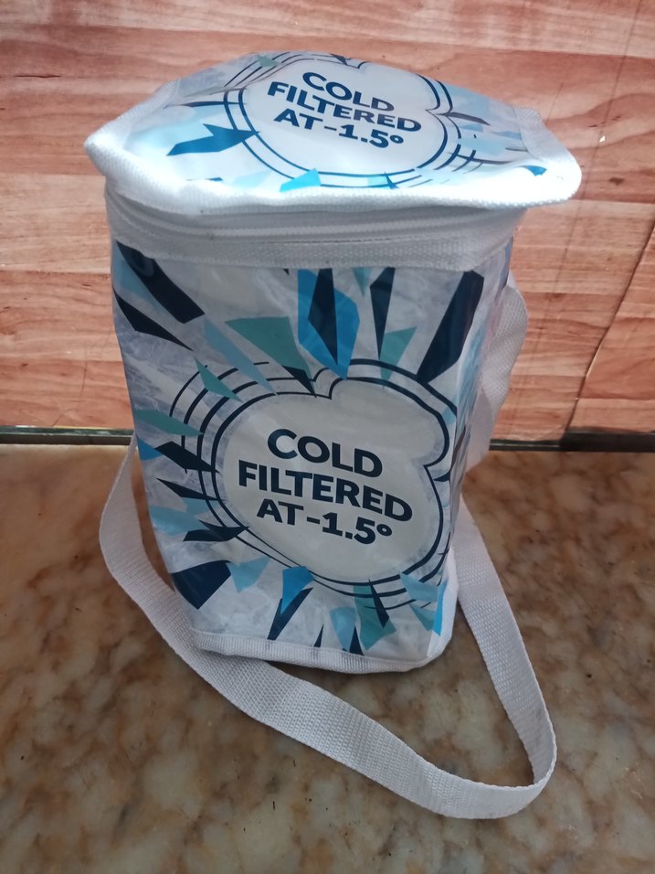 Taşıma askılı beyaz soğuk sıvı saklama çantası, içeriği -1.5°C'de soğuk ve filtreli tutar. Canlı mavi desenlere ve net yazıya sahiptir. 24*10*16 cm