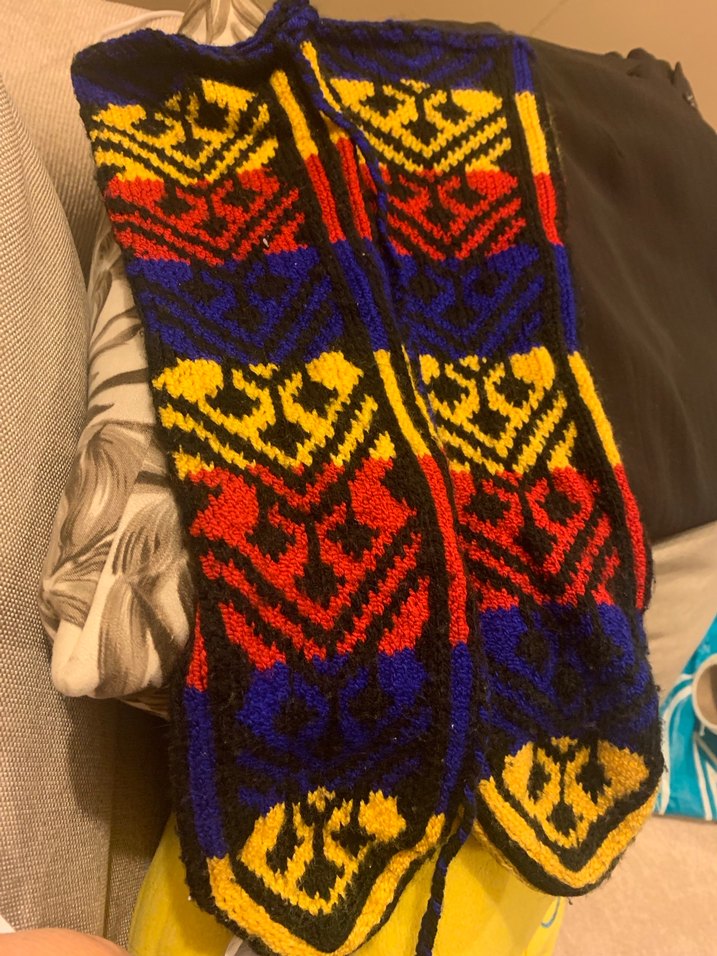 Soğuk günler için kırmızı, sarı ve mavi renklerde çok renkli desenli, sıcak tutan çorap sıcacık tutuyor el örgüsü