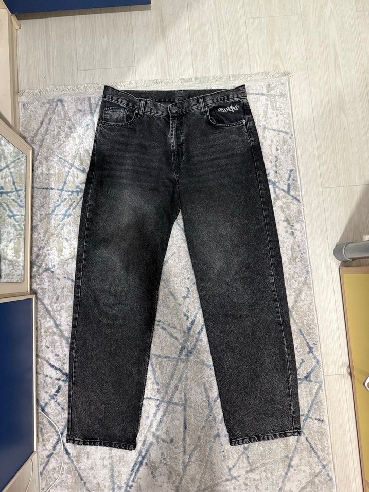 Gri renkli, bol kesim kot pantolon, kemerli ve midi boyda, günlük sokak stiline uygun rahat bir seçim.