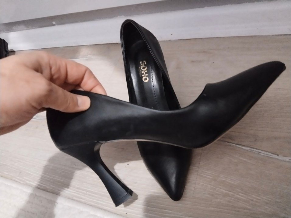 SOHO markalı siyah parlak yılan desenli, tokalı stiletto topuklu kadın ayakkabı. Ofis için modern klasik tarzda, kauçuk malzemeden yapılmıştır.