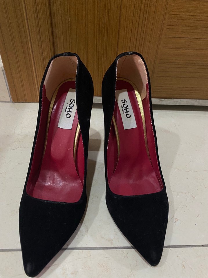 SOHO markalı siyah süet stiletto topuklu, sivri burunlu ve modern klasik tarzda. Ofis kullanımına uygun, zahmetsiz şıklık sunar.