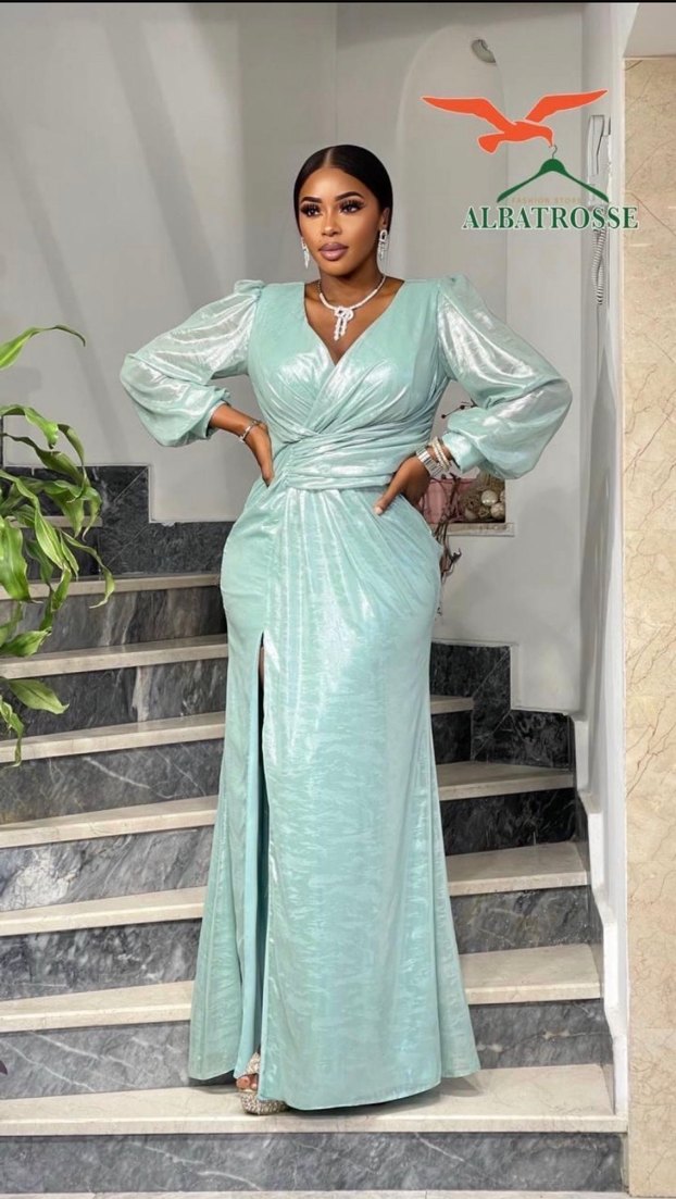 Turkuaz renkli, uzun kollu ve V yaka drapeli abiye elbise. Parlak batik desenli, düzenli kesim ve şık görünüm sunar. 44,46,48 bedenler mevcuttur.