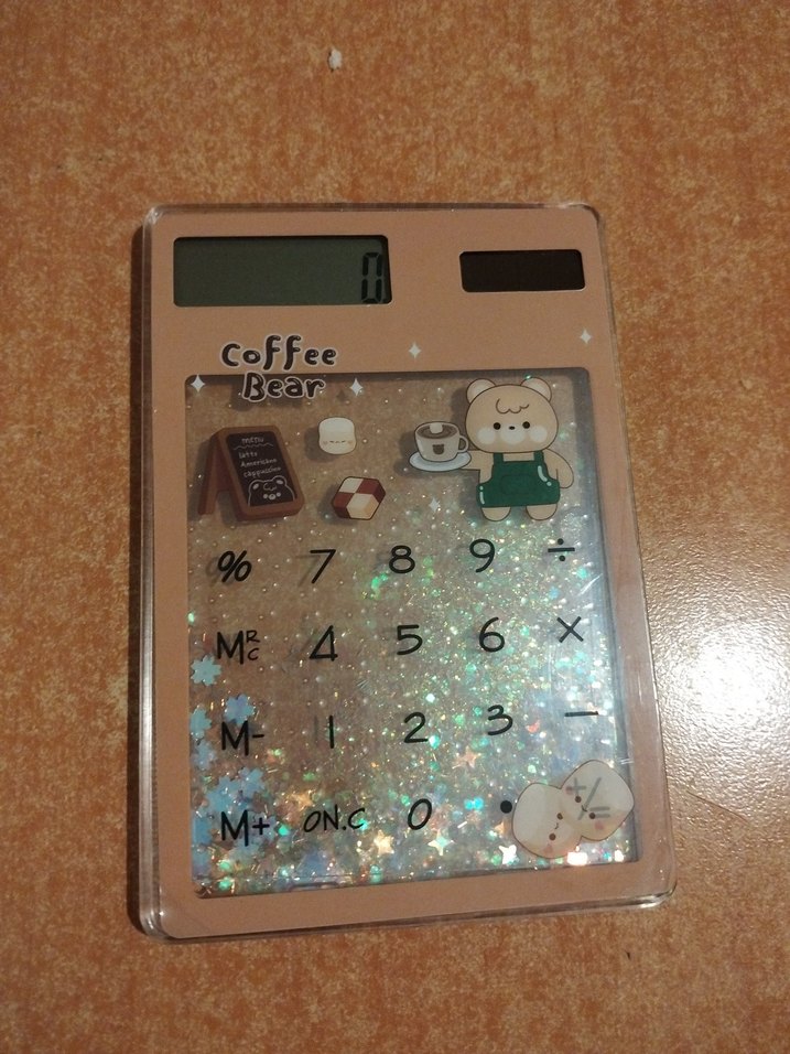 Açık kahverengi, kahve temalı ayıcık tasarımlı simli hesap makinesi. Parlak arka plan ve temel fonksiyonlar içerir. Güneş paneli ile çalışır. ☕