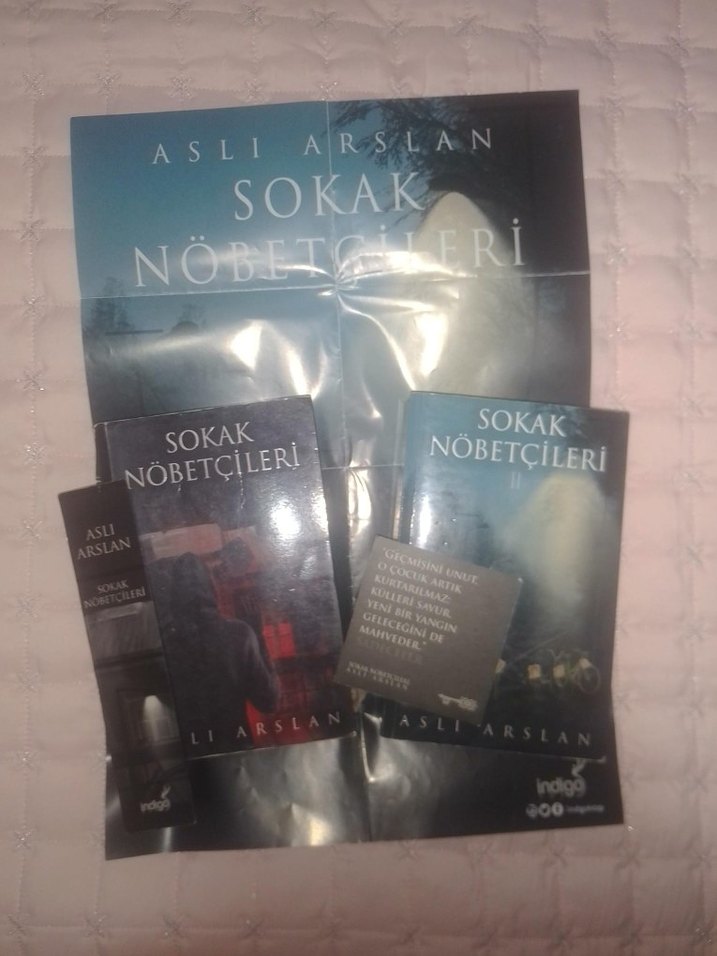 Aslı Arslan'ın 'Sokak Nöbetçileri' adlı roman seti, 1 ve 2. kitap. Bir poster, bir ayraç, bir yazı kartı vardır.