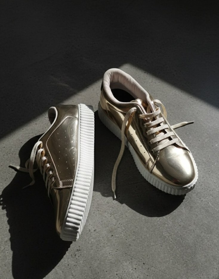 Parlak altın renkte, kauçuk tabanlı platform kadın spor ayakkabısı. Sokak stilini zahmetsiz şıklıkla birleştirir. Kadın snaker ayakkabı Tam kalıp Sadece 39 kaldı