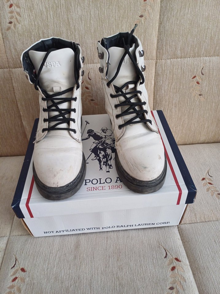 Beyaz ve gri renkte, sokak stiline uygun Üzerinde 'POLO, SINCE1890' yazısı bulunur.