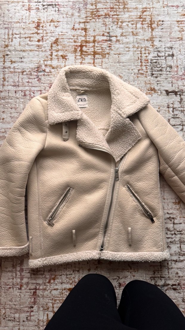 Bej renkte, kürk detaylı yakaya ve yumuşak dokulu kumaşa sahip kadın ceket. Notched lapel yakalı, fermuarlı cepli, bol kesim ve midi boyda, günlük sokak stili için uygundur.