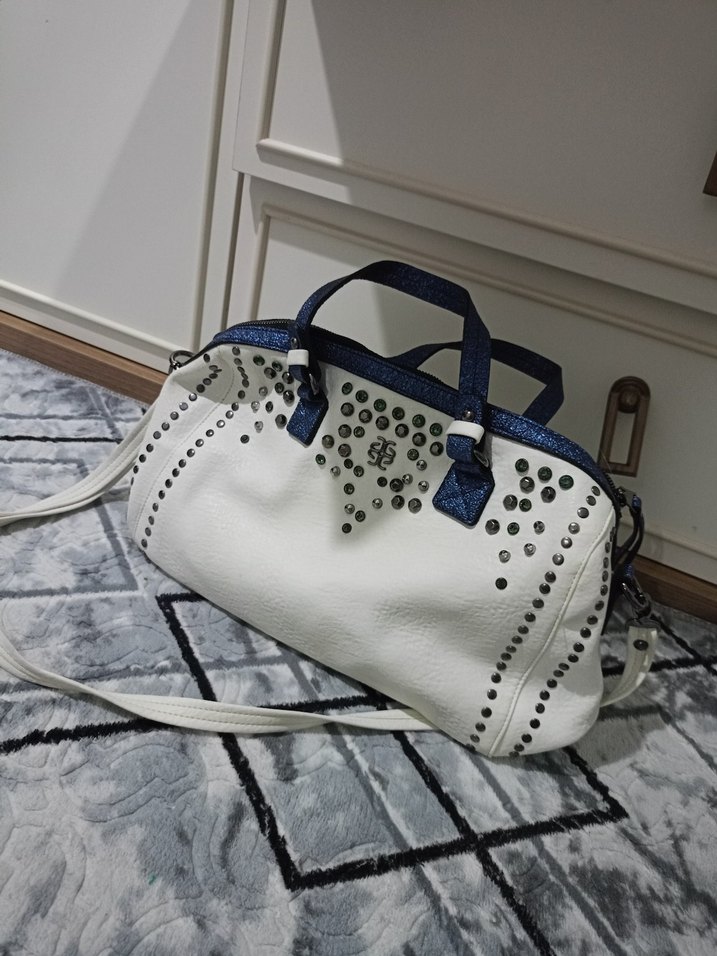 Beyaz deri kadın çanta, baskılı desen ve tokalı detaylarla sokak stiline uygun, günlük kullanıma şık bir seçenek sunar.